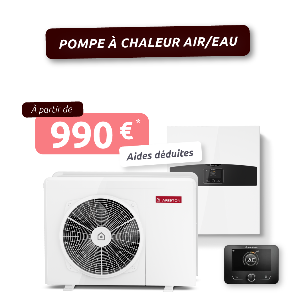 Pompe à chaleur air/eau : ARISTON NIMBUS PLUS S NET R32 ou THOMSON ETHER d'une valeur de 9 900€ TTC (prix catalogue).
